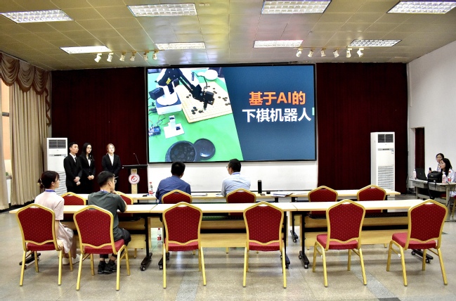 校党委副书记曾华平到终审决赛现场认真查看作品展板并与参赛同学亲切交谈。曾华平高度肯定了我校学生的作品创新性与操作独立性,勉励同学们发挥专业特长,加强创新创造,为建设科技强国贡献青春力量。