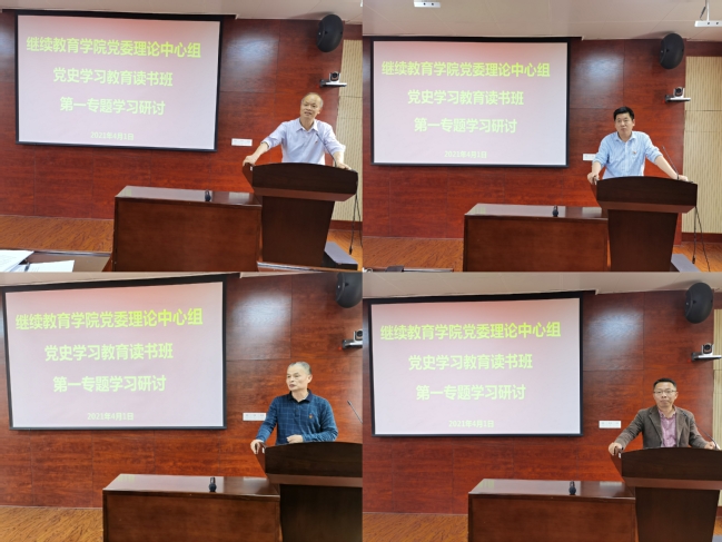 4月1日下午,继续教育党委理论中心组在学院五楼多媒体教室,开展党史学习教育读书班第一专题学习研讨。学院党委书记范焕谦主持,全院教职工参加。