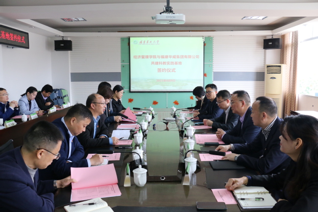 4月9日上午,经济管理学院与福建华威集团有限公司举行科教实践基地签约仪式。福建华威集团有限公司副总裁林辉华、总裁助理兼投资发展中心总经理施跃庭、总裁办主任赵家春、人力资源中心总经理林芳、党群工作室主任陈燕、人力资源中心副总经理罗伙连、福建华威农产品供应链有限公司总经理吴东、副总经理张翔飞、经济管理学院副院长石德金、坚瑞、管曦、李坤明以及部分系主任、教师代表出席了本次签约仪式。签约仪式由副院长坚瑞主持。副院长李坤明代表学院与福建华威集团有限公司签订了共建科教实践基地合作协议。
