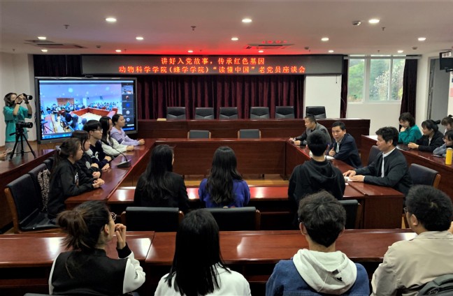 4月7日,动物科学学院(蜂学学院)在新圣农楼七楼大会议室举办了“讲好入党故事,传承红色基因”为主题的座谈会,本次座谈会采用线上与线下相结合的方式,特邀修金生教授为主讲人,学院领导班子成员徐通明、黄小红,工会主席,学院团委负责人,部分辅导员以及本院学生代表200人参加了本次座谈会。