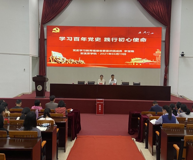 4月19日下午,安溪校区·安溪茶学院党委组织开展党史学习教育宣讲报告会,党史学习教育省委宣讲团成员、马克思主义学院李宝艳教授为学院全体师生党员带来了一场生动精彩的党史辅导课,报告会由校区·学院党委书记连文主持。