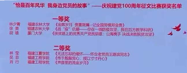 在启动仪式上,省总工会揭晓并举行了“恰是百年风华.我身边党员的故事”征文比赛获奖单位代表颁奖活动。我校选送的2篇作品荣获“一等奖”。获奖作品及作者是:《金辉岁月贵重斑斓——记全国劳模郑金贵》(作者:林少菁,校工会);《战“疫”伉俪——你在一线防疫攻坚,我在后方教学科研》(作者:徐昊,计算机与信息学院)。王育敏代表我校获奖者上台领奖。
