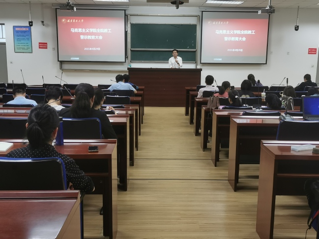 4月29日下午,马克思主义学院在禧强楼206教室召开全院教工警示教育大会,会议由学院党委书记雷国铨主持。
