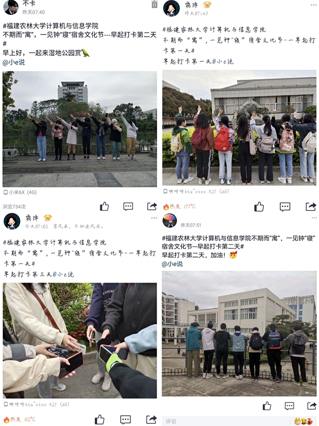 此次文化节活动包括“e起打卡”“舍服设计大赛”“安全知识竞赛”三项子活动。“e起打卡”共吸引了101组参赛队伍参加,活动旨在帮助同学们养成良好的作息习惯,相互督促,共同进步;舍服设计大赛让同学们在繁忙的学习中得到放松,通过分工协作共同创作原创舍服,加深了宿舍成员之间彼此的联系;“安全知识竞赛”通过主题知识竞答,加深了同学们的安全意识,为构筑和谐校园贡献自己的力量。