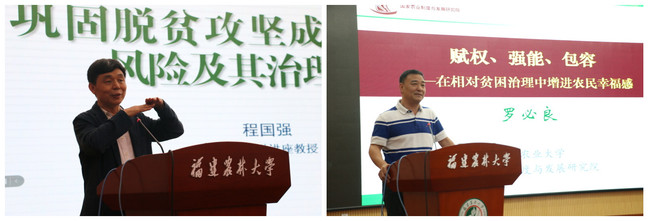 国务院发展研究中心学术委员会原秘书长、国际合作局原局长、同济大学现任特聘教授程国强教授和广东省“珠江学者”特聘教授罗必良教授主讲。两位专家分别以《巩固脱贫攻坚成果:返贫风险及其治理逻辑》及《赋权、强能、包容:在相对贫困治理中增进农民幸福感》为题,面向在场百余名师生进行学术交流研讨。