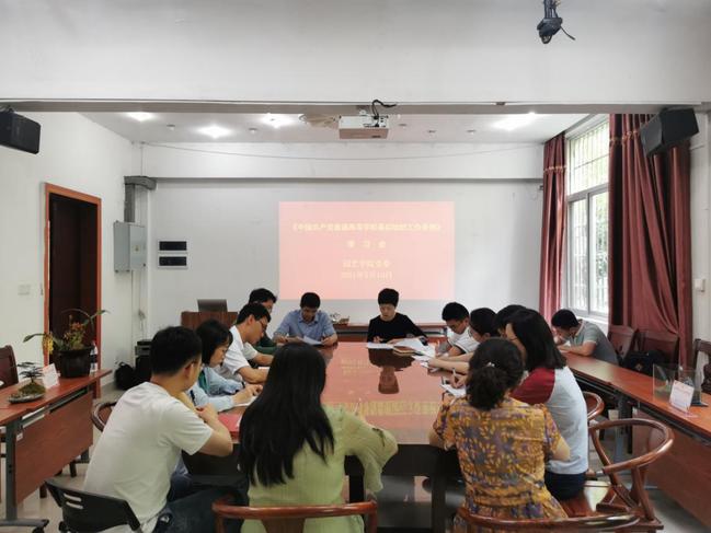 康恩慧从《中国共产党普通高等学校基层组织工作条例》修订背景、主要原则、关键问题等重点角度展开解读,与会同志深入领会《条例》精神,并结合《条例》要求,对学院坚持和加强党的全面领导、进一步规范党支部工作进行了深入研讨。