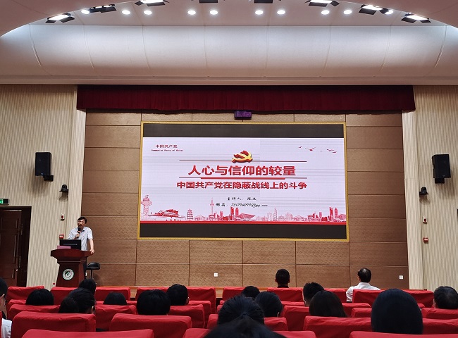 陈文以“从隐蔽战线的斗争看中国共产党为什么能”为题,详细介绍了中国共产党在新民主主义革命时期隐蔽战线斗争的三个主要阶段:“逼上梁山”的土地革命战争;“重整旗鼓”的全民族抗战时期和“胜券在握”的解放战争时期。宣讲会上,陈文强调,党的每一段革命,都是一部生动的理想信念教材,广大党员、干部要自觉接受红色传统教育,认真学习党史,不断感悟,巩固和升华个人理想信念。
