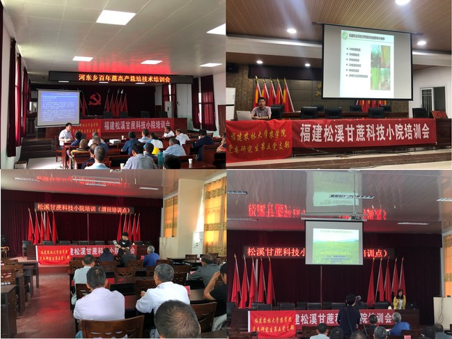 服务团一行先后来到了松溪县的郑墩镇、河东乡、旧县乡、溪东乡等几个乡镇的百年蔗种植产地,深入各个乡镇调查当地百年蔗的种植情况,并在松溪甘蔗科技小院负责人的组织下,为当地蔗农带来了《“百年蔗”轻简栽培技术》和《“百年蔗”病虫害绿色防控》专题培训。
