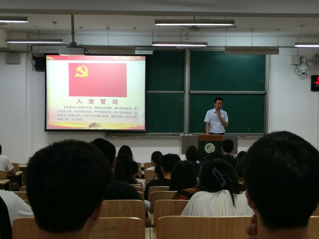 全体毕业生党员面向党旗,庄严宣誓:“我志愿加入中国共产党,拥护党的纲领,遵守党的章程……”。