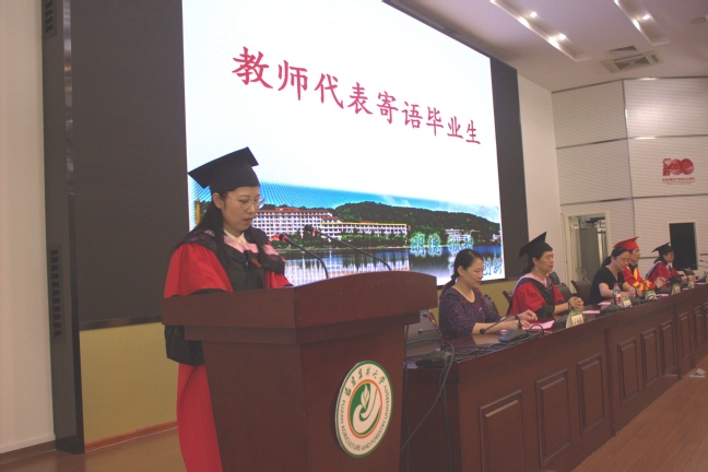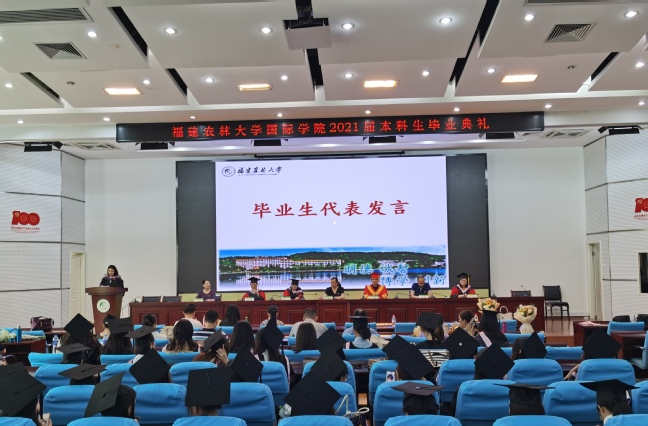 毕业典礼在毕业生代表的情景诗朗诵《永远的校园》中拉开序幕, 在舒缓的背景音乐中,四位同学将大学美好时光娓娓道来。在全场唱响庄严的国歌后,2018级英语专业张志昊同学作为在校生代表发言,表达了对学长学姐们的衷心祝愿和惜别之情;2017级英语专业庄栎萍同学作毕业生代表发言,回顾了大学四年期间的学习、生活,向母校做深情告白,感谢母校四年来的培育与教导;教师代表陈白璧教授表达了对同学们的深深祝福,叮嘱毕业生要树立终身学习的理念,坚守底线,成为传播社会正能量的中坚力量,并对同学们提出了“求学,品学兼优;经商,讲求诚信;执教,为人师表;从政,一身清廉”的希望。