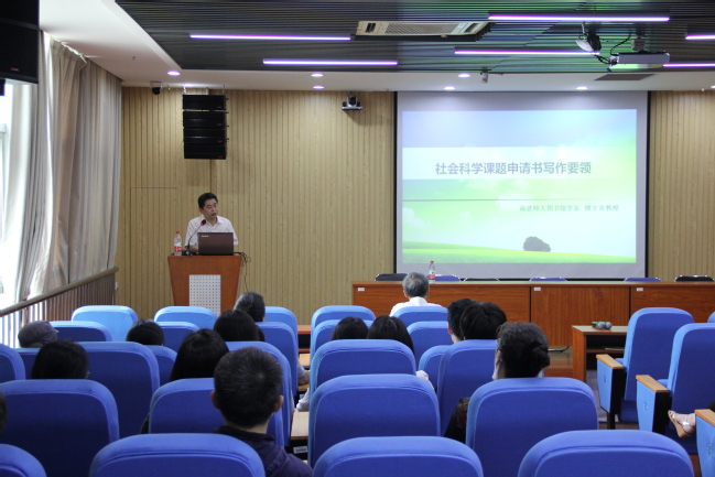 6月10日下午,福建师范大学社会历史学院傅文奇教授应邀做客我校金山讲坛第112讲,在逸夫图书馆视听阅览室为我校师生作了一场题为《社科课题申报书写要领》的讲座,我校研究生和图书馆专业馆员共100多人参与,图书馆党委书记、馆长罗志雄主持讲座。