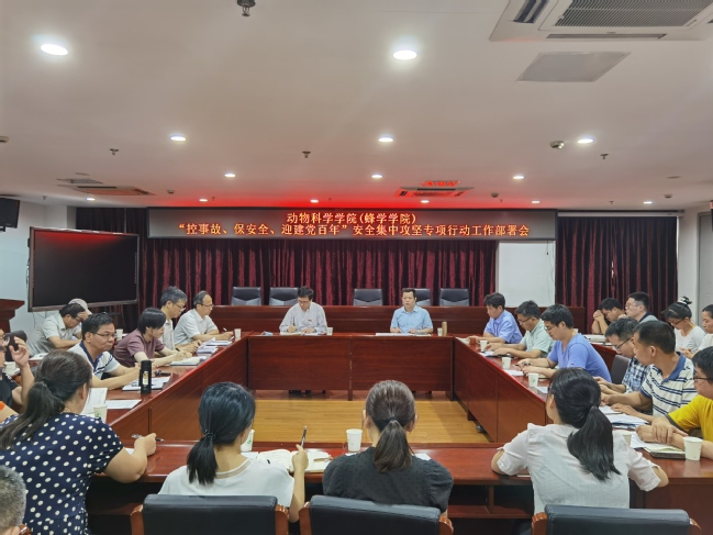 6月11日下午,动物科学学院(蜂学学院)在学院会议室召开“控事故、保安全、迎建党百年”工作部署会。学院领导班子成员、党委委员、各教学系(实验室)负责人、全体科级干部、辅导员和实验人员等参加。会议由学院党委书记黄毅军主持。