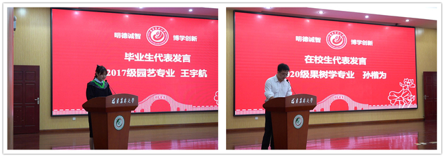 在校生代表2020级果树学专业研究生孙楷为同学为全体毕业生送上真诚的祝福,表示会以他们为榜样,坚定目标,砥砺前行。