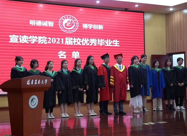 院党委书记肖红新宣读《关于表彰2021届“优秀毕业生”的决定》、副院长曾黎辉宣读《关于聘任林水英等16位同志为校友联络员的通知》,学院领导为优秀毕业生及校友联络员颁发证书并合影留念。