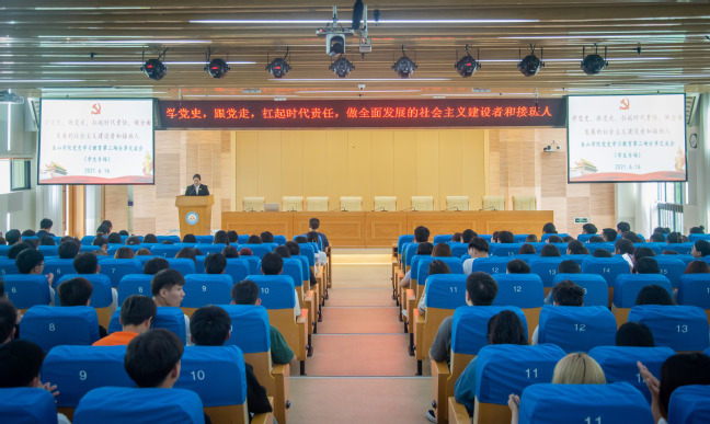 6月16日下午,金山学院在学院综合楼十三层学术报告厅召开党史学习教育第三场分享交流会。学院6位学生党员围绕“学党史、跟党走,扛起时代责任,做全面发展的社会主义建设者和接班人”主题分享了学习心得。党委宣传部、学工部有关负责人、各系政工干部代表、学生党员代表200多人参加会议,会议由院党委副书记李晓辉主持。