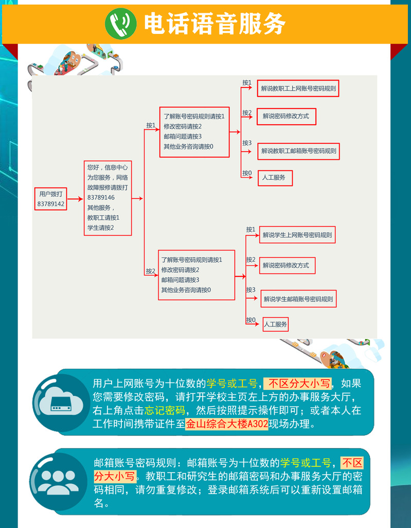 据了解,以往师生在遇到个人上网帐号密码问题需要拨打咨询电话时,时常出现占线或非工作时间无法联系等难题,无法第一时间得到解决。信息中心结合深入开展“我为群众办实事”实践活动,把为师生服务的理念贯彻到每一个岗位、每一项工作中去,聚焦师生群众急难愁盼问题,积极回应师生关切:一是统一校内上网登录账号,建立“一人一号”的数字认证互联互通互认体系;二是分析师生来电咨询问题并归类,引入电话语音服务平台;三是实现电话语音自助服务,随时了解上网账号密码规则和电子邮箱系统,如有其他需求还可选择人工服务。该平台上线后,提高了师生解决上网帐号密码问题的效率,也无需花时间到中心办公室现场办理,让师生实现“一趟不用跑”的目标,不断增强师生群众的获得感、幸福感。