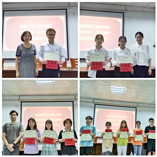 6月15日晚,农学院于学院302教室举办了“扶困扶贫,知恩感恩”主题征文颁奖仪式暨心得分享会。农学院党委副书记林素文,学院团委书记林彬彬,辅导员林佳庆、金呈蒙、郑晓阳出席本次活动,各学院获奖学生及各班代表同学参加。