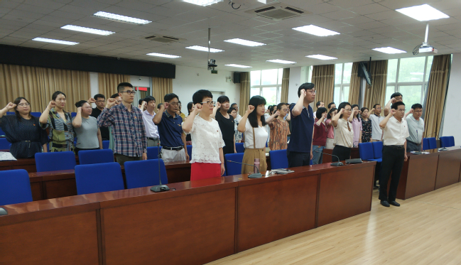 6月23日下午,马克思主义学院党委在禧强楼206报告厅开展“喜迎100年建党,牢记初心使命,重温入党誓词”主题活动,组织全体教职工党员重温入党誓词,院党委书记雷国铨领誓。