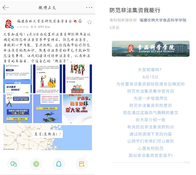 组织线上宣传。通过学院官方微博、微信公众号推文拓宽宣传渠道,应用师生喜闻乐见的图文并茂形式说明,非法集资的含义、特征、表现形式及常见手段,并结合典型非法集资案件,以案说法,揭露犯罪分子的惯用伎俩,揭示非法集资的欺骗性、风险性及社会危害性,进一步增强师生对非法集资的认识和风险防范意识。