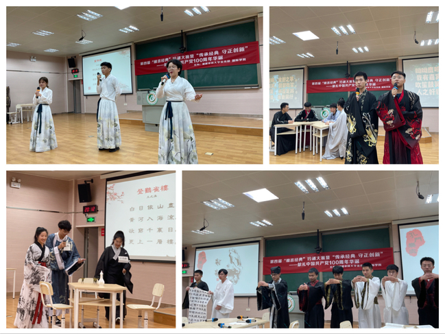 本次大赛共有十个小组入围,各参赛小组通过情景剧、古今对话、孔门乐礼、舞蹈器乐等丰富多样的形式与创意,吟诵中华经典诗文,赓续中华文明星火,献礼建党一百周年。同学们精彩的诵读和表演,激发了现场观众的情感共鸣,热烈的掌声此起彼伏。