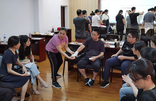 此次培训为期一天,主要包括现场心肺复苏、现场气道异物梗阻的急救方法、三角巾及弹性绷带在止血、包扎、固定上的应用等。受训的教职工认真地聆听急救培训师的要点讲解后,展开实操。经过一天的学习、练习,全体受训人员都顺利完成实操考试、取得救护培训员证书。