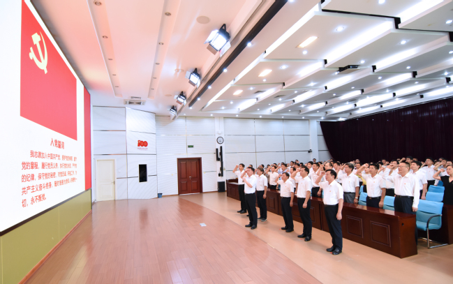 校党委书记严金静,校党委副书记、校长兰思仁,校党委副书记庄祥生、曾华平,校党委常委、校纪委书记邱应龙,校党委常委、副校长黄炎和,副校长郑宝东,校党委常委、副校长林庆藩,与全校中层干部早早来到禧强楼学术报告厅主会场共同观看大会的直播实况,认真聆听习近平总书记的重要讲话。庆祝大会结束后,党员校领导和党员中层干部整齐列队,面向党旗肃立,在严金静书记的带领下重温入党誓词。大家郑重举起右拳,高声宣读入党誓词,铿锵有力的宣誓声响彻大厅。