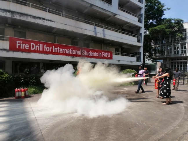 为进一步提高中外学生消防安全意识和火灾防范自救能力,国际学院联合校保卫处于7月3日上午在北区来华留学生公寓开展消防安全教育演练。