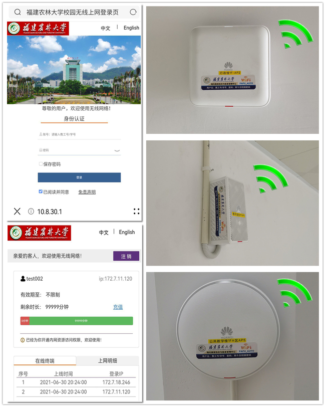 日前,通过信息中心与无线网络建设施工队多次现场协调沟通、加班加点,我校自主建设的第三期无限网络工程已基本完成,并进入试运行阶段。试运行以来,测试工作得到师生们的支持,最近一周高峰时达到1000多人同时在线。师生们可以通过连接无线FAFU_AUTO,用自己的工号、学号和统一身份认证的密码登录使用,每个账号可以同时登录两个终端,满足师生日常学习工作需要。下一阶段,中心将进一步加快网优和测试账号漫游,实现学校第一、二期和第三期接入统一的认证系统,优化功能,实现无缝对接,让我们师生在信息化发展过程中有更多的获得感、幸福感。