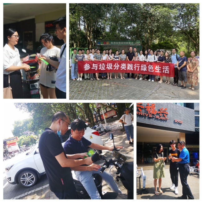 7月5日上午,国际学院国学教工党支部、外语教工党支部和公共外语教工党支部组织党员教师到学校东区住宅区、南区宿舍区等垃圾投放点开展“我为师生办实事”之“参与垃圾分类,践行绿色生活”党员志愿服务活动。