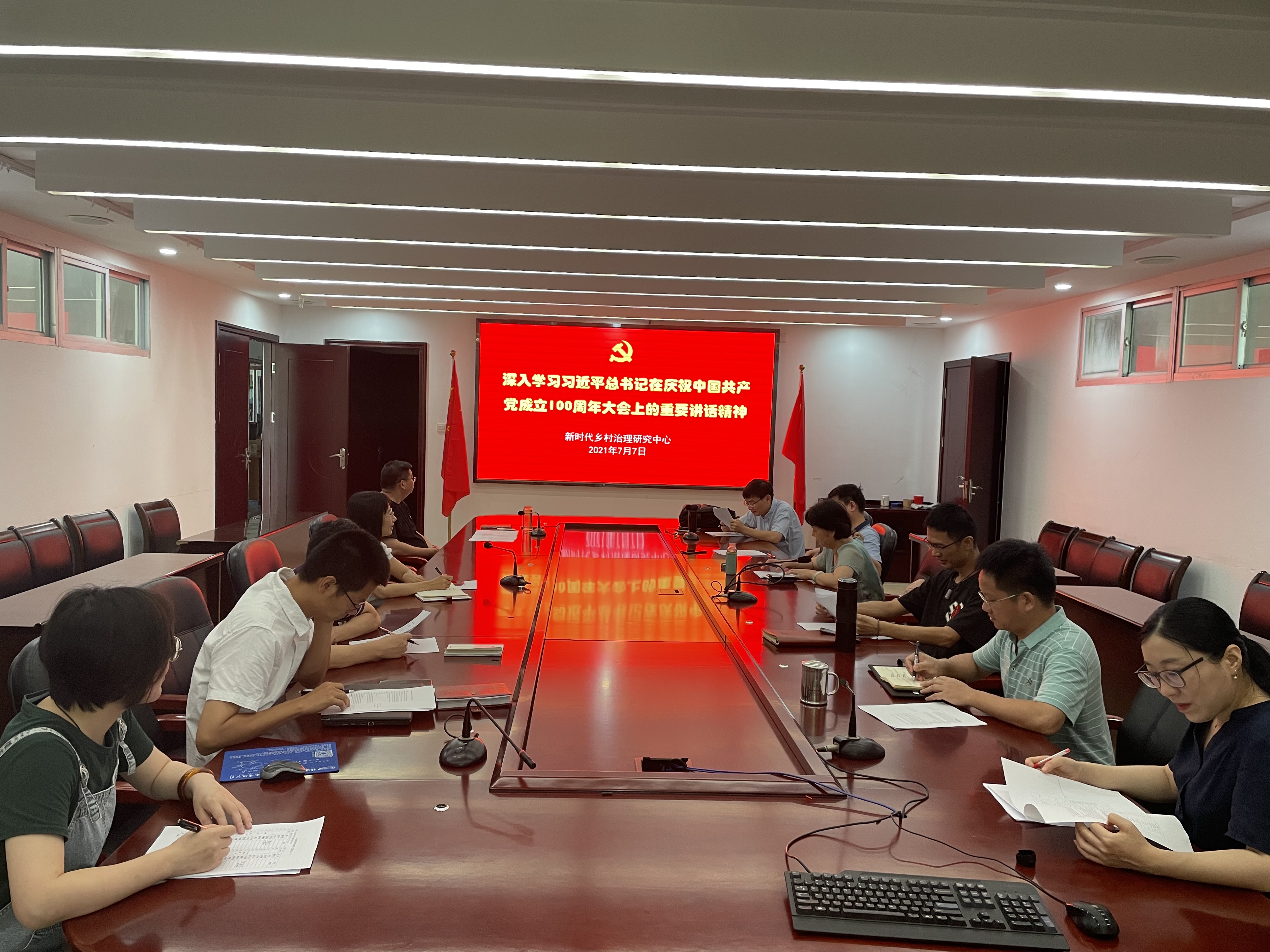 7月7日上午,新时代乡村治理研究中心东苑10号楼512会议室召开会议,专题学习习近平总书记在庆祝中国共产党成立100周年大会上重要讲话精神,会议由中心主任郑逸芳主持,中心骨干成员参加学习。