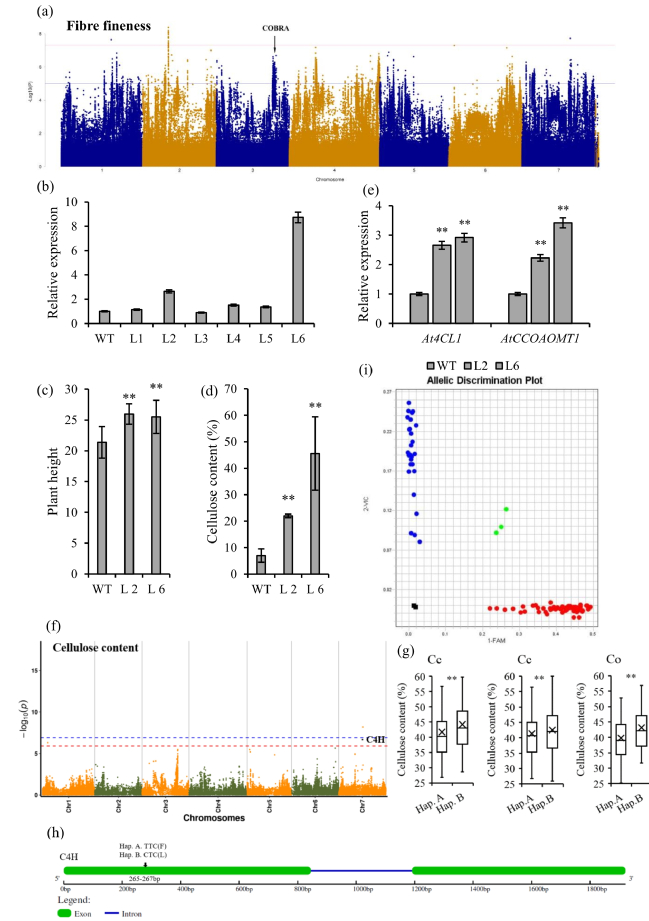 全基因组关联分析(GWAS)鉴定了数百个控制纤维品质相关性状(包括纤维细度、纤维素含量和木质素含量)的重要基因位点(图2)。结合选择性清除分析发现,纤维细度QTL的微丝酶家族蛋白CcSFP1、蛋白质精氨酸甲基转移酶CcPRMT7等候选基因位于选择性清除区域,推测这些基因受到了驯化选择。利用竞争性等位基因特异性PCR(Kompetitive Allele Specific PCR, KASP)和转基因技术验证了控制黄麻纤维品质的候选基因CcCOBRA1和CcC4H1的功能。这些基因的挖掘,为黄麻纤维品质的遗传改良提供了重要的基因位点。