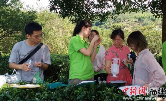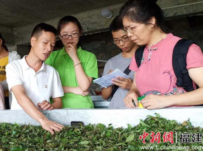 在同安镇汇和茶业有限公司,陈李林老师为茶农们开展茶园有害生物绿色防控讲座,通过PPT展示,系统讲解了如何通过科学管理构建优良茶园生态环境的知识,并对如何有效提高茶园生态系统服务功能的措施做了具体阐述。在富泉乡贵香茶厂,师生们现场观摩了白茶的制作工艺流程,陈李林老师与茶厂制茶师深入探讨了制茶工艺流程,为茶厂在白茶萎凋处理工艺等方面提出建设性的指导意见,帮助茶厂解决了生产过程中存在的瓶颈问题。