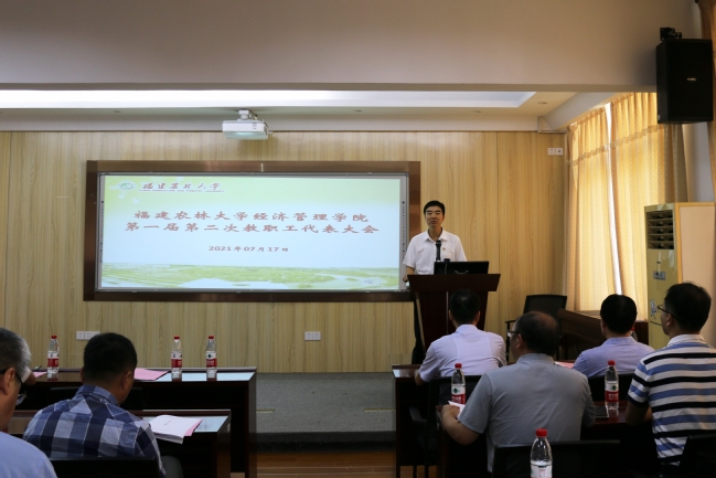 副校长、经济管理学院院长林庆藩致开幕词,他指出,这次会议时值中国共产党成立100周年,是在全院上下认真学习贯彻习近平总书记在庆祝中国共产党成立100周年大会上的重要讲话精神、来闽考察重要讲话精神以及深入开展党史学习教育、扎实推进“再学习、再调研、再落实”活动之际召开的一次重要会议。他要求全体代表要心系群众,凝心聚力,认真履职,服务师生,进一步深化落实新时代教育评价改革,推进学院融合、优势互补,促进学院高质量发展。