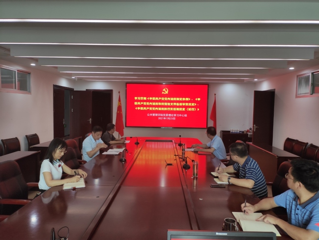 7月23日上午,公共管理学院党委理论学习中心组专题学习《中国共产党党内法规制定条例》《中国共产党党内法规和规范性文件备案审查规定》《中国共产党党内法规执行责任制规定(试行)》等三部党内法规。学院理论中心组成员参加学习,院党委书记曾起郁主持会议,会议在中心组成员前期自学的基础上进行集中学习,曾起郁进行了领学,他详细解读了三部党内法规出台的背景、意义、主要内容和有关要求。参会人员分别结合自身的岗位,交流了学习心得。