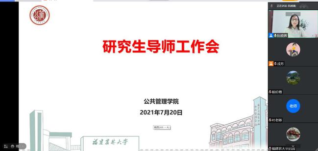为进一步贯彻习近平总书记来闽考察重要讲话精神,深入推进研究教育改革发展,提高研究生培养质量,健全学位论文质量保证体系,提升硕士学位论文水平,公共管理学院于7月20日晚通过腾讯会议在线举行研究生导师工作会。会议由院长阮晓菁主持。70多名校内外研究生导师参加会议。