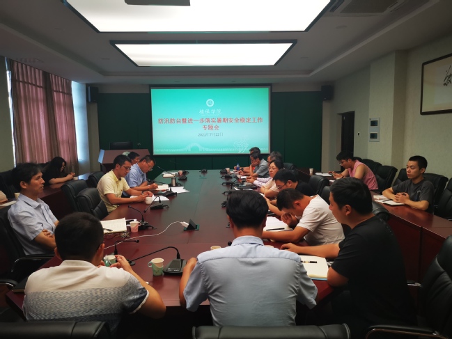 学楼703会议室召开防汛防台暨进一步落实暑期安全稳定工作会议。院党委书记林栋主持会议,学院党政领导班子成员、系主任、教工党支部书记、科室负责人和全体辅导员参加会议。