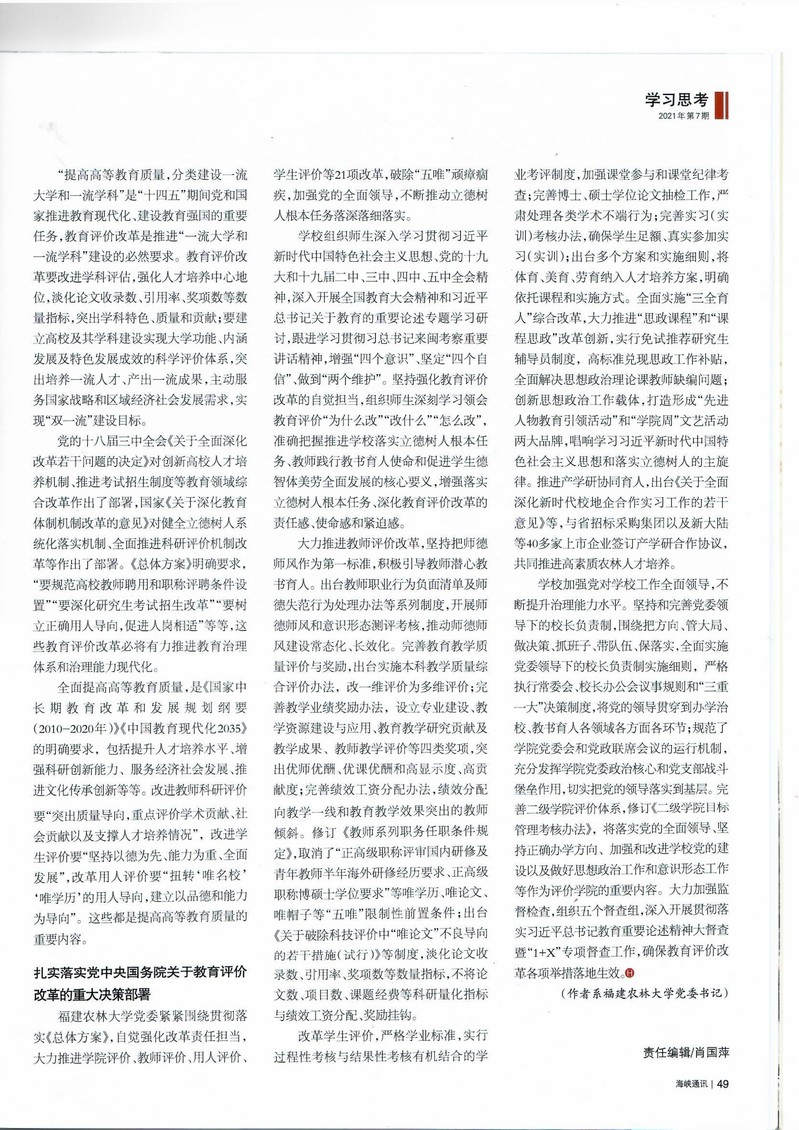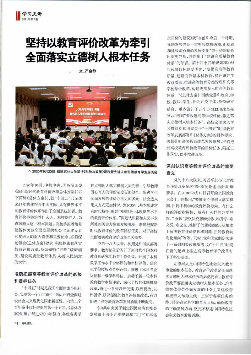 编者按:中共福建省委主管主办的综合性时政期刊《海峡通讯》刊登我校党委书记严金静的署名文章《坚持以教育评价改革为牵引 全面落实立德树人根本任务》,现全文转载如下。