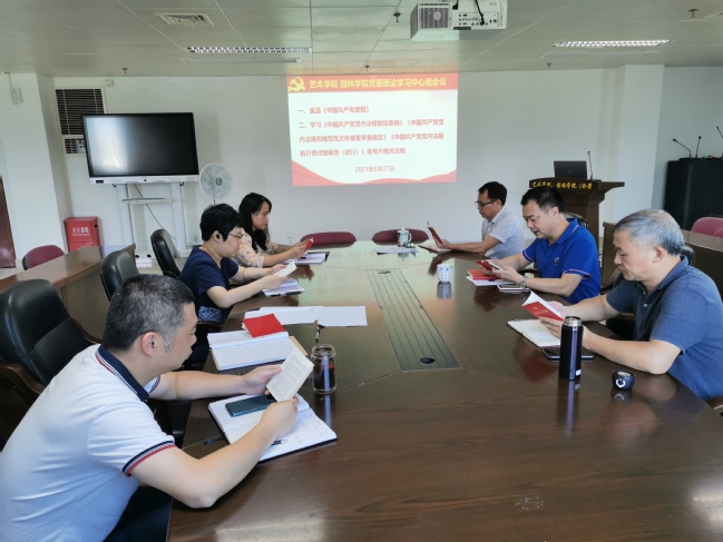 8月27日上午,艺术学院园林学院党委书记陈为德主持召开学院党委理论学习中心组会议,学习《中国共产党党内法规制定条例》等党内相关法规,学习习近平总书记在西藏考察期间的重要讲话精神,以及全省深化教育督导体制机制改革暨2021年秋季学期开学工作部署视频会议精神和学校2021年秋季学期开学工作部署会议精神,并研究部署学院贯彻落实意见。