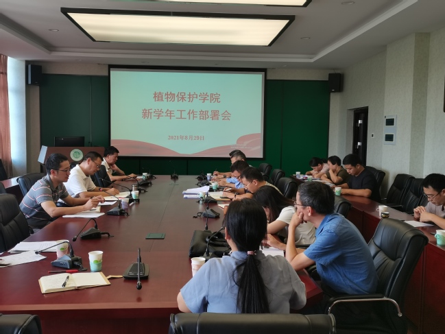 8月29日上午,植物保护学院在博学楼703会议室召开新学年工作部署会。院党委书记林栋主持会议,学院党政领导班子成员、系主任、教工党支部书记、科室负责人和全体辅导员参加会议。