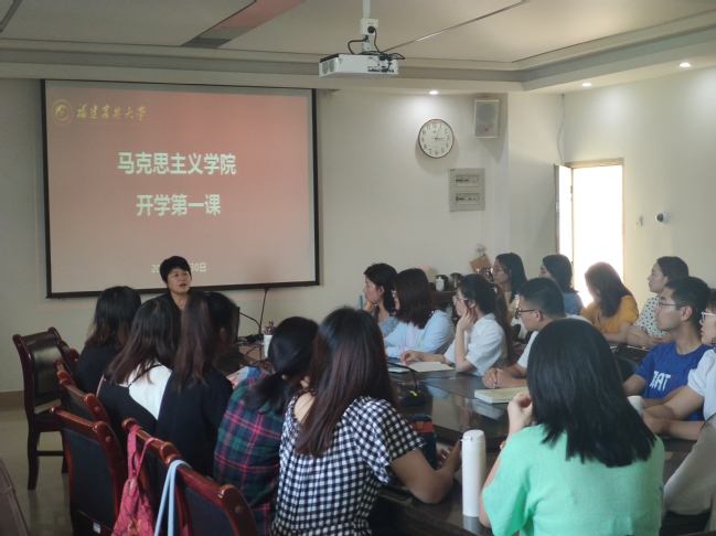 8月30日下午,马克思主义学院组织全院学生于明德楼613采取线上线下相结合的方式开展本学期的“开学第一课”,本次课程由院长刘新玲,副院长陈潜、林贤明担任主讲人。