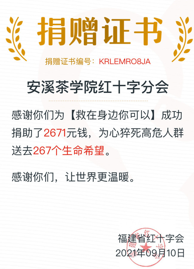 为响应《福建省红十字会关于组织参加2021年“99公益”网络募捐活动的通知》,更好推进“互联网+公益”在学院开展,引领学院师生参与公益行为,在今年“99公益日”期间,安溪茶学院组织全体师生积极参与“99公益日”募捐活动。