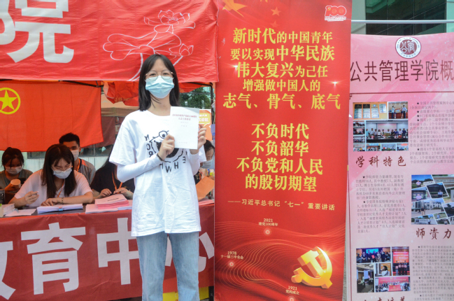 迎新现场,每一位新生都收到来自学院一份特殊的礼物——习近平总书记《在庆祝中国共产党成立100周年大会上的重要讲话》读本。“这真是一份不一样的礼物,今年是建党100周年,开学第一天就收到这样一份礼物”“我回去一定再认认真真学习总书记的重要讲话精神,以史为鉴,努力充实我的大学生活。”“我要和总书记青年寄语海报合影,不忘总书记的殷切期望!”公共管理学院新生们如是说。