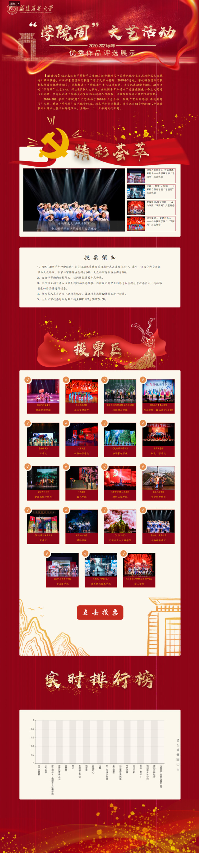 2020年11月-2021年6月,2020-2021学年“学院周”文艺活动共计19场次文艺晚会分别于金山校区、旗山校区及安溪校区顺利举办。经过各学院遴选推荐及学校初审初评,来自18个学院的19件作品入围优秀作品线上展示和评选环节。即日起至2021年9月30日,学校全体师生均可通过登录活动官方专题网站,观评优秀作品并参与大众评审投票。
