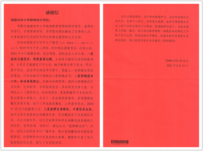 近日,73096部队87分队发来感谢信,高度评价植物保护学院学生卢静雯服役期间的出色表现。