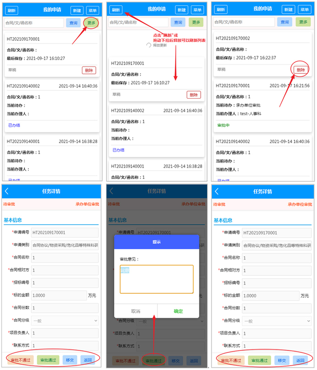 手机移动端合同与印鉴审批系统在原有电脑PC端使用功能的基础上进行优化,突破了时间和地点限制,有关经办人和负责人随时随地可以用手机办理、审批,大大缩短等待时间,审批效率、便捷程度得到了极大提高,实现了审批全程数据化,“让数据多跑路,让老师少跑腿”。教职员工可以登录手机“今日校园”APP,在“OA服务”栏目下,点击“印鉴审批”,用手机移动端进行各种材料的申请、审批或查看办理进展情况。