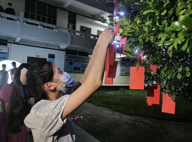 在“寄语秋月,写下心中愿”祈愿活动里,同学们在红纸上写下祝福,将心中梦想以及对抗疫成功的祝福融进了款款文字中,用红绳将其挂于许愿树上,祈愿疫情阴霾早日散去,国泰民安,家国安康。