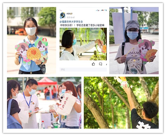 在春晖桥畔,“花好月圆夜,农林美当时”沉浸式校园文化中秋游园通过“一线”式游园,通过设置多个打卡点、表演点等互动项目,让同学们在游玩中感受到了浓郁的中国传统文化氛围。在“寻月光宝盒——农小林陪你集福抗疫”主题校园趣味打卡活动中,通过“线上+线下”的形式在校园内设置“抗疫农小林”主题纪念拼贴板打卡,以形式新颖、寓意美好、趣味性强的活动形式,营造喜迎中秋的校园氛围。在“讲文明,树新风,迎中秋”宿舍环境卫生“秀一秀”活动中,通过开展宿舍大扫除的形式迎接中秋,引导学生培养良好卫生习惯,提高文明素质,推动了校园环境卫生整治工作。
