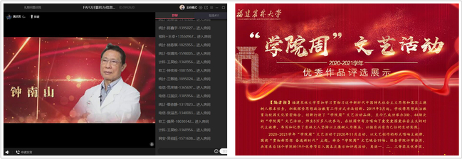 深入推进先进人物引领教育,上好开学思政“第一课”。中秋期间,各学院抓实新生入学教育,上好新生开学思政“第一课”,结合党史学习教育,深入开展先进人物引领教育活动,以先进人物和榜样事迹教育引导学生,深化爱党爱国爱校教育。9月19日,材料工程学院在旗山校区召开以“汲取榜样力量,践行使命担当”为主题的新生代表座谈会,学院党委书记、副书记、辅导员及新生代表参会。座谈会上,新生代表们结合观看先进人物引领教育专题视频的感悟,畅谈自身的收获体会,纷纷表示要将先进人物的事迹铭记在心,以先进人物为榜样,在日后的学习、工作当中努力学习专业知识、牢固树立忠于祖国奉献人民的意识,为实现中华民族伟大复兴的中国梦添砖加瓦。资源与环境学院通过线上线下相结合的方式组织开展2021级新生入党启蒙第一课。活动特别邀请校关工委副主任、菌草所党支部副书记林文钦作题为“奋斗者人生无悔——谈大学生为什要积极入党”辅导讲座。林文钦从党的事业需要、国家需要、人民需要,高校历来重视在大学生中培养党员两个层面详细阐述大学生为什么要积极争取入党,勉励同学们珍惜当下,感恩生活,努力奋斗,做一个有理想、有追求、有責任、有担当的人,通过讲座学习,增强了新生的入党意愿。公共管理学院开展“五看齐五促进”先进人物引领教育之向教育科研人物看齐活动,组织2021级新生线上学习学习林占熺、黄大年、袁隆平、李保国、张桂梅等教育科研先进人物的优秀事迹,深入结合党史学习教育活动,以向教育科研先进人物看齐、以向革命先辈先进人物看齐、向抗疫先锋先进人物看齐、向基层先进人物看齐、向青春榜样看齐的“五看齐”为主线,着重促进新生爱国爱党爱校荣院精神形成、促进自觉抗疫习惯养成、促进优良学风养成、促进青年才干养成、促进青年志愿服务精神形成,做到“五促进”,将先进人物引领教育不断走深走透。国际学院“归国学者讲坛”开讲,闽江学院校长王宗华教授通过线上线下两种方式为全体2021级中加项目新生做题为“我可以,你可以,我们大家都可以”的分享,畅谈如何做好人生规划,结合个人求学、科研、出国深造等丰富的人生经历和中加项目优秀学子的成长成才事迹,勉励全体同学早日树立个人梦想、勇于追逐梦想,走向社会、走向世界,讲座拓宽了学生的视野,引领学院学子科学规划人生、逐梦前行。“学院周”文艺活动优秀作品评选展示得到了师生的广泛支持和关注,目前评选展示专题网站浏览量为6751,参与大众评审投票师生数2258,人次数3371,有效投票数40452。