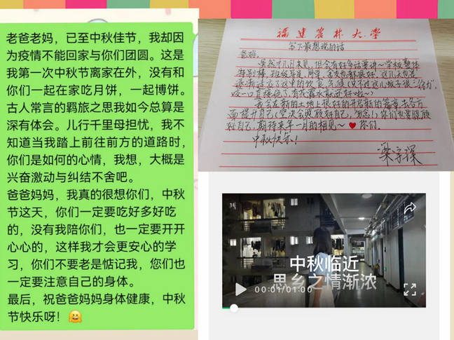 据悉,此次活动系常态化疫情防控背景下校园文化活动之一,旨在鼓励同学们积极响应就地过节号召,引导青年学子在节日期间给父母、家人送去问候,感恩父母家人,慰藉学生的思乡之情,使学生在学校也能充分感受到家的温暖。