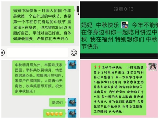 中秋佳节将至,“每逢佳节倍思亲”,大家思念家乡的心情倍加浓烈。为了让同学们抒发自己对家人的思念,同时度过一个快乐的假期,学院组织开展了“浓情中秋节,情系父母恩”中秋感恩活动。活动引起了广大学生的共鸣,从活动伊始就有许多同学踊跃参加,向父母抒发自己的感恩与思念,道出了一段又一段感人的话语。每句含蓄的话语背后隐藏着父母与子女间深厚的爱意,展现了亲情纯洁、无私、温暖、美好的特质。